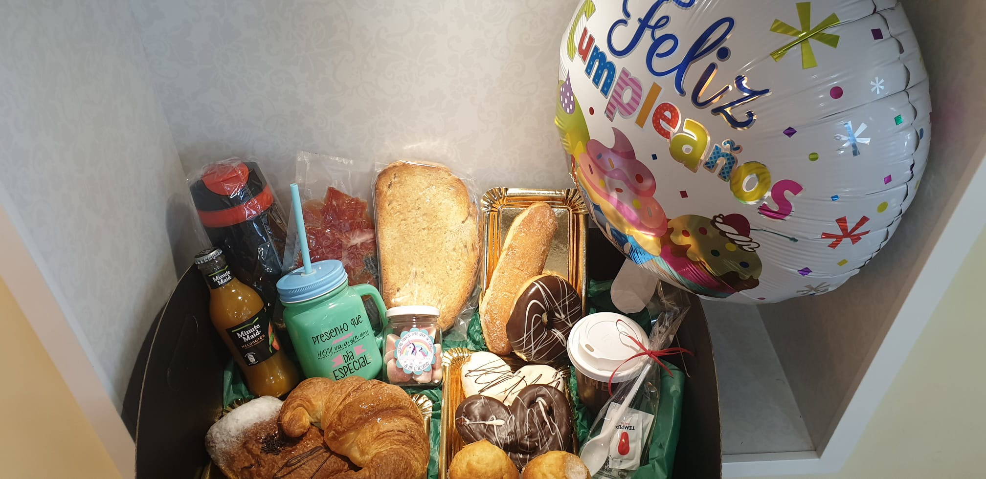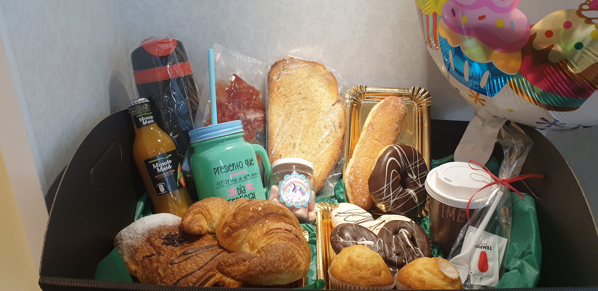 El precio total de 40€ incluye: 1 bebida principal + 1 zumo + 1 Napolitana + 1 Donut + 1 Pepito (en todos los anteriores se puede elegir la variedad) + 1 tosta de jamón ibérico + 1 Croissant + 2 Minipalmeritas + 2 Magdalenas + 1 Taza «Smoothie» + 1 tarrito de chuches «Unicorns» + 1 Globo de cumpleaños feliz + cubiertos + servilletas + azúcar + bandeja + tarjeta con dedicatoria y envoltorio de regalo.