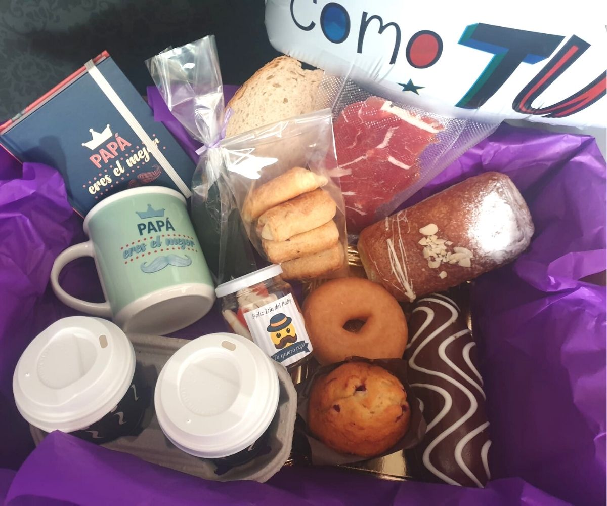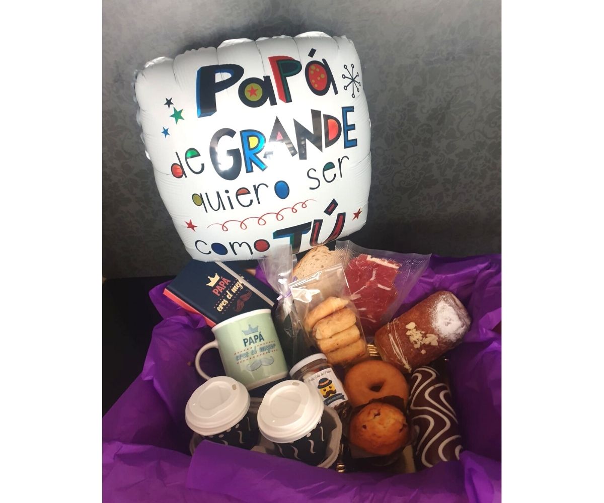 Recuerda que además de estos productos con variantes, este desayuno incluye: 2 variados de saladitos (12 unidades), 2 Tostas de jamón, 1 taza del día del padre, 1 globo felicitación papa, un tarrito de chuches y un llavero.