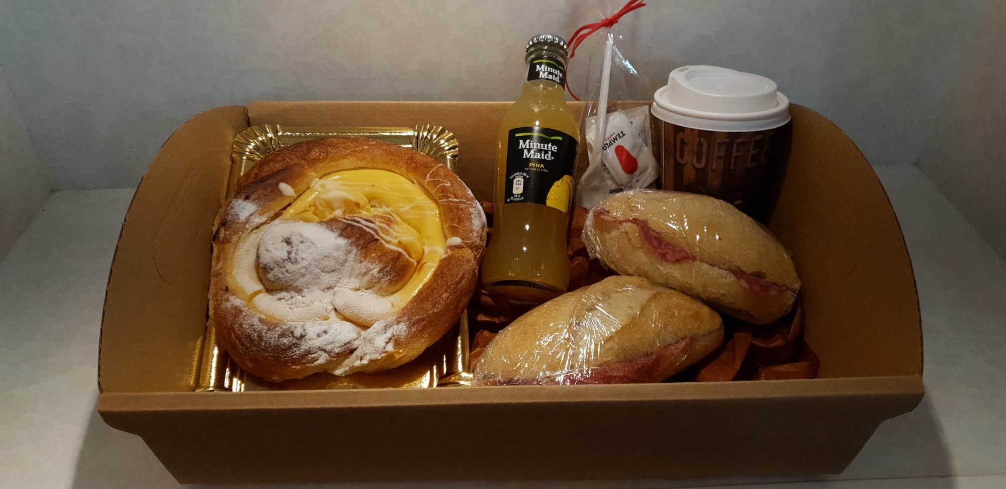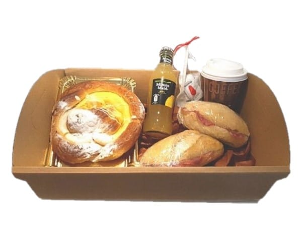 El precio total de 35€ incluye: 2 bebidas principales + 2 zumos + 2 desayunos + 4 bocatines (jamón, queso y chorizo, salchichón ibérico) // ó saladitos + cubiertos + servilletas + azúcar + bandeja + tarjeta con dedicatoria y envoltorio regalo.